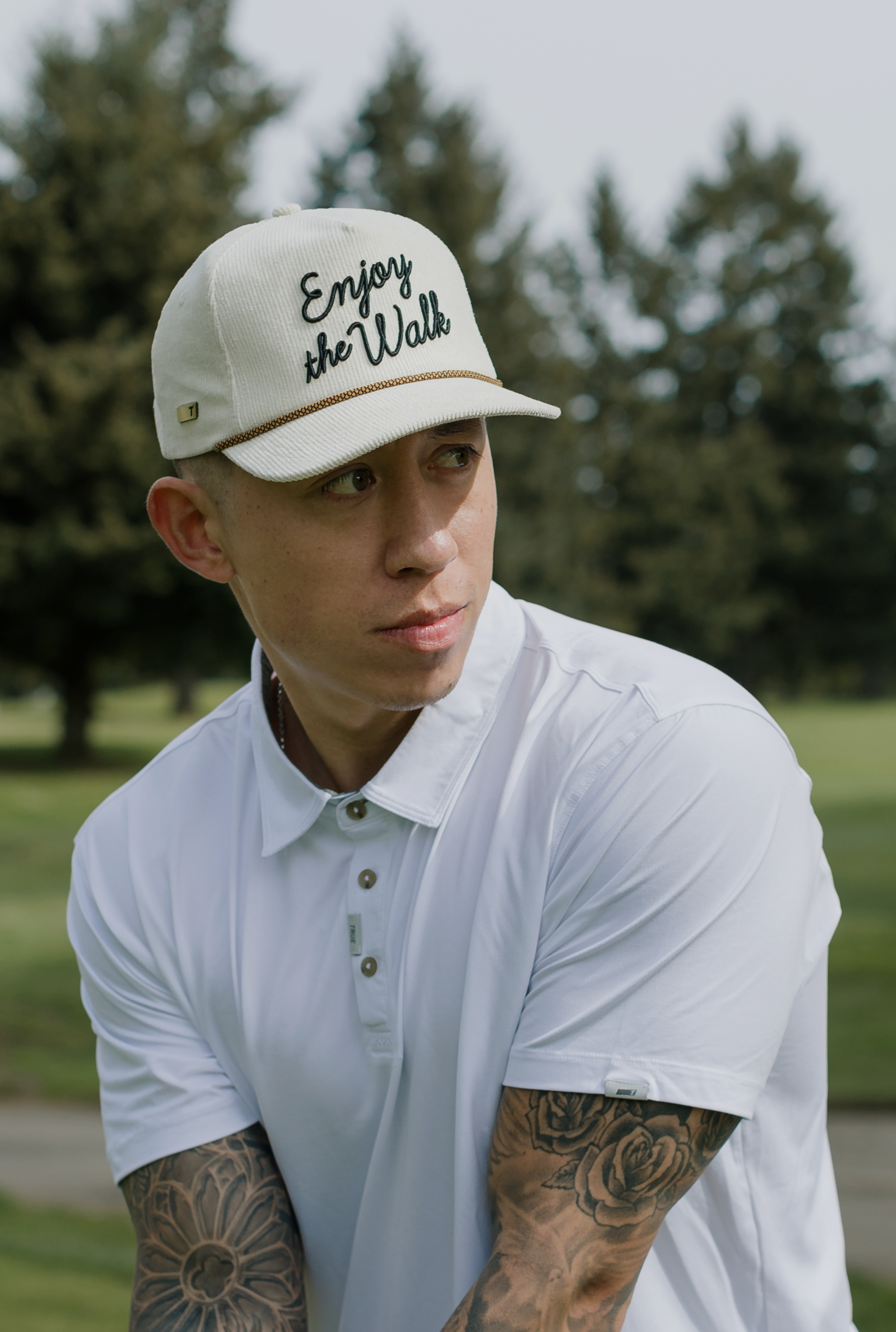 Introducing the TRUE 5-Panel Corduroy Strapback featuring our signature “Enjoy the Walk” script. This hat has a classic corduroy vibe with a modern twist, perfect for anywhere - on the course, at the beach, or out for a night. Crafted for ultimate comfort and style, it features a structured front, straight brim, and adjustable leather backstrap with stylish brass accents. Your new go-to for looking sharp and feeling good, wherever you are.